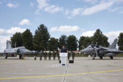 Κύριε Αρχηγέ της Πολεμικής Αεροπορίας, χρόνια σας πολλά, στελέχη της Πολεμικής μας Αεροπορίας, κυρίες και κύριοι, για την Ελλάδα κάθε ενίσχυση της άμυνας της αποτελεί προβολή ειρήνης. Στον 21ο αιώνα άλλωστε δεν έχουν θέση ούτε η προφανής παραχάραξη της ιστορίας και της γεωγραφίας ούτε τα αυθαίρετα και απειλητικά πυροτεχνήματα. Πολύ περισσότερο όταν εκπέμπονται από γειτονικά κράτη. Σε όλα αυτά απαντούν το διεθνές δίκαιο και η εθνική μας εγρήγορση.