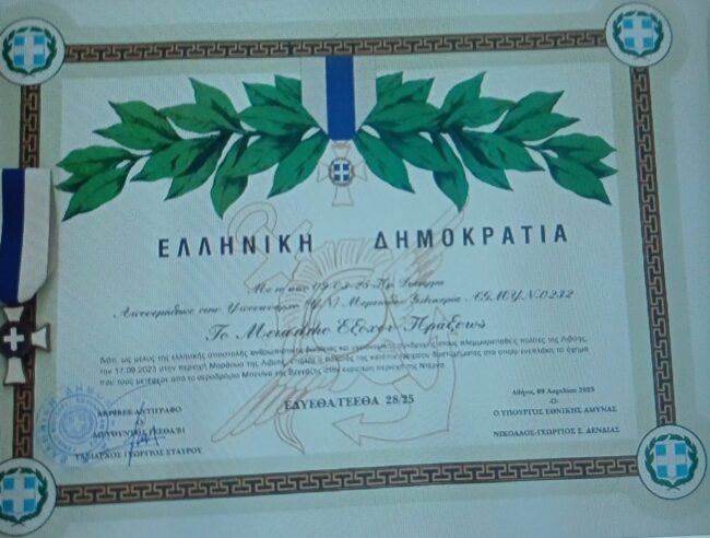 Επίσης, με πρόταση του Υπουργού Εθνικής Άμυνας, απονεμήθηκε το Μετάλλιο Εξόχου Πράξεως στα κάτωθι στελέχη των Ενόπλων Δυνάμεων, διότι ως μέλη της ελληνικής αποστολής ανθρωπιστικής βοήθειας και υγειονομικής συνδρομής στους πλημμυροπαθείς πολίτες της Λιβύης, στις 17/09/2023, με απαράμιλλο θάρρος και αυτοθυσία, έπραξαν οτιδήποτε ήταν εφικτό, προκειμένου να διαφυλάξουν την ασφάλεια και τη σωματική ακεραιότητα των ιδίων και των λοιπών μελών της αποστολής: