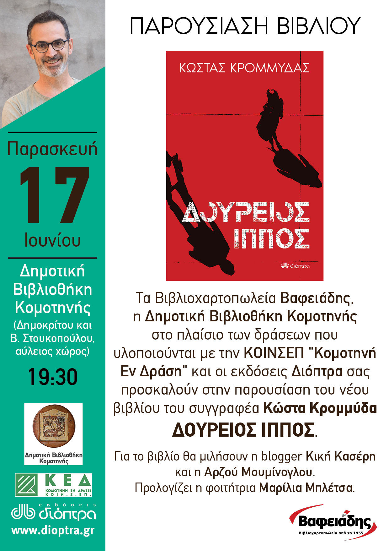 Η Δημοτική Βιβλιοθήκη Κομοτηνής στο πλαίσιο των δράσεων που υλοποιούνται με την ΚΟΙΝΣΕΠ «Κομοτηνή Εν Δράσει», τα Βιβλιοχαρτοπωλεία Βαφειάδης, και οι Εκδόσεις Διόπτρα, σας προσκαλούν στην παρουσίαση του νέου μυθιστορήματος του