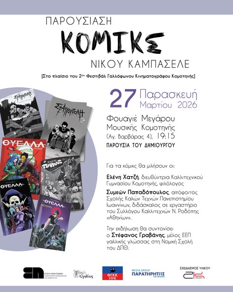 Η Στέγη Πολιτισμού Ανατολικής Μακεδονίας και Θράκης, στο πλαίσιο του Προγράμματος «Ορφέας 2026», το 2ο Φεστιβάλ Γαλλόφωνου Κινηματογράφου Κομοτηνής και οι εκδόσεις Παρατηρητής της Θράκης σας προσκαλούν στην παρουσίαση των κόμικς του Νίκου Καμπασελέ, η οποία θα πραγματοποιηθεί παρουσία του δημιουργού την Παρασκευή 27 Μαρτίου 2026, στις 19:15, στο φουαγιέ του Μεγάρου Μουσικής Κομοτηνής (Αγ. Βαρβάρας 4).