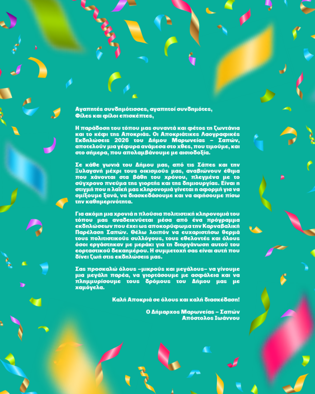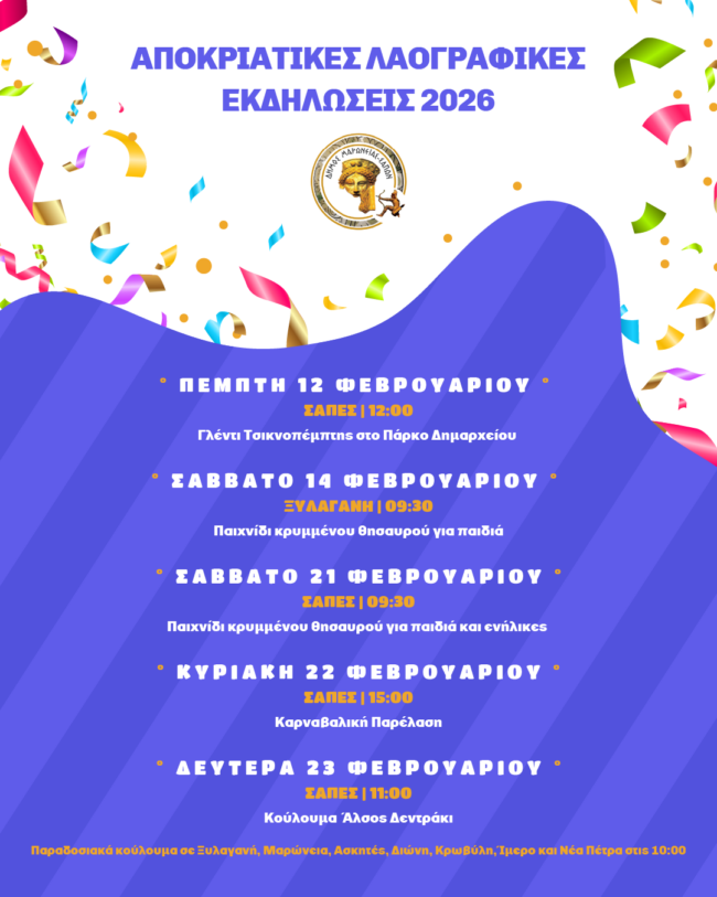 ΑΡΧΙΚΗΚΟΙΝΩΝΙΑΤΟΠΙΚΗ ΑΥΤΟΔΙΟΙΚΗΣΗΠρόγραμμα Καρναβαλικών Εκδηλώσεων του Δήμου Μαρωνείας- Σαπών ΘΡΑΚΙΚΗ ΑΓΟΡΑ12 Φεβρουαρίου, 2026 7:16 μμΞεκίνησαν για φέτος οι καρναβαλικές γιορτές στο Δήμο Μαρώνειας- Σαπών. Δείτε παρακάτω αναλυτικά των πρόγραμμα των εκδηλώσεων: ΚΑΤΗΓΟΡΙΑ ΕΚΔΗΛΩΣΕΙΣΚΟΙΝΩΝΙΑΠΟΛΙΤΙΣΜΟΣΤΟΠΙΚΗ ΑΥΤΟΔΙΟΙΚΗΣΗ Μοιραστείτε τό
