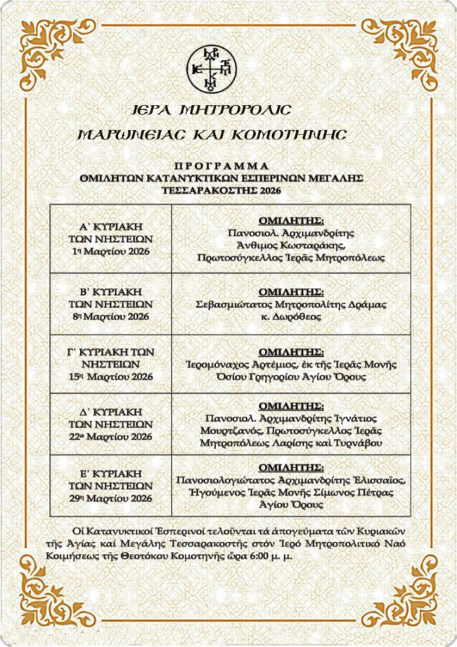 ΠΡΟΓΡΑΜΜΑ ΚΑΤΑΝΥΚΤΙΩΝ ΕΣΠΕΡΙΝΩΝ  2026 ΙΕΡΑΣ ΜΗΤΡΟΠΟΛΕΩΣ ΜΑΡΩΝΕΙΑΣ ΚΑΙ ΚΟΜΟΤΗΝΗΣ