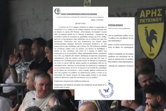 Σε μια πρωτοφανή ανακοίνωση προχώρησε το πρωί της Τρίτης η ΕΠΣ Δράμας με αφορμή όσα συνέβησαν στον αγωνα ανάμεσα στον Αρη Πετεινού και την Δόξα Βώλακα.