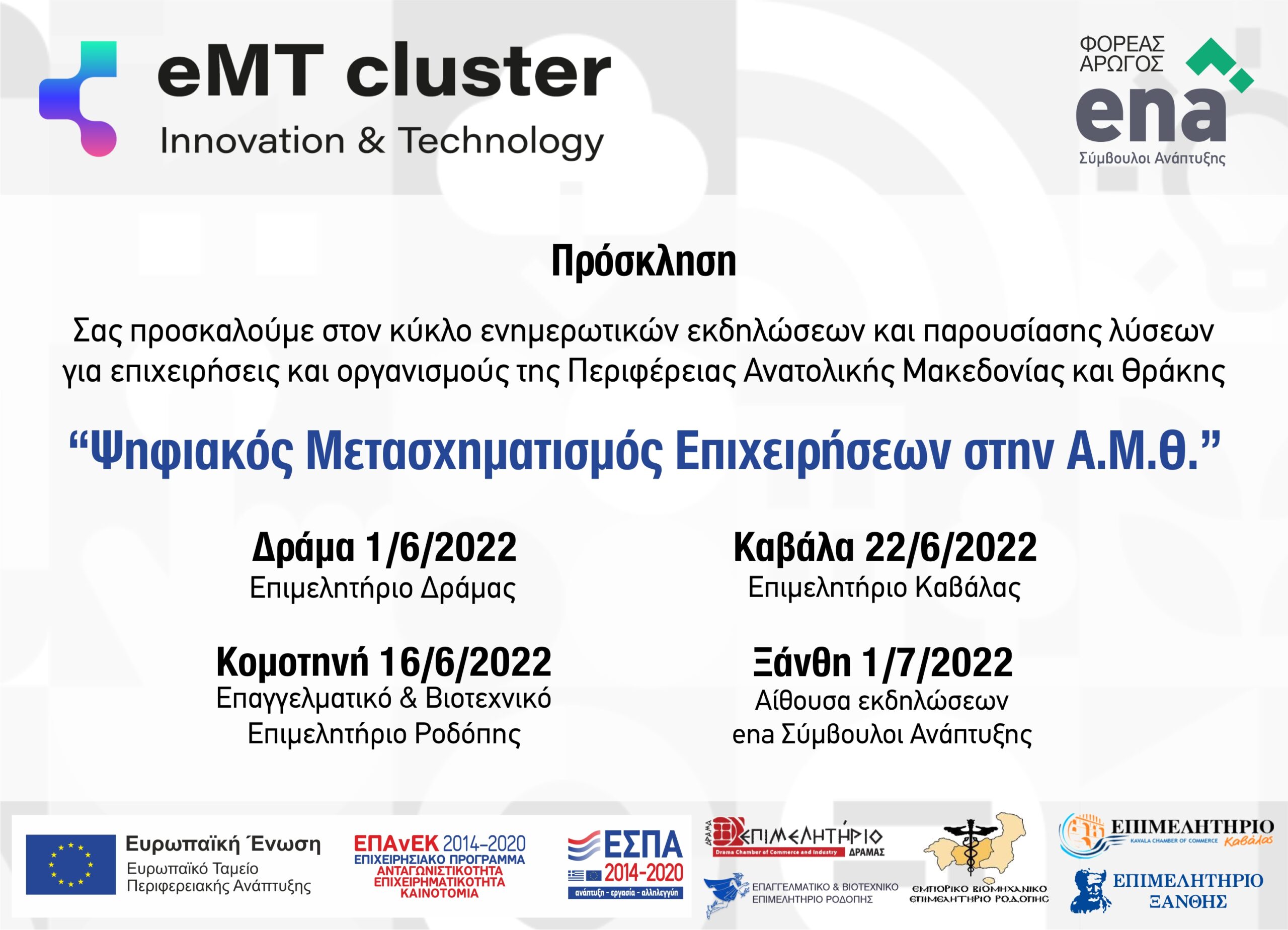 Η ena Σύμβουλοι Ανάπτυξης, Φορέας Αρωγός του eMT cluster, του πρώτου συνεργατικού σχηματισμού Καινοτομίας & Τεχνολογίας στην Περιφέρεια Ανατολικής Μακεδονίας & Θράκης, σε συνεργασία με το Επαγγελματικό & Βιοτεχνικό Επιμελητήριο Ροδόπης, το Εμπορικό& ΒιομηχανικόΕπιμελητήριο Ροδόπης και τις 18 εταιρείες προηγμένων λύσεων τεχνολογίας που συνθέτουν το eMT cluster,