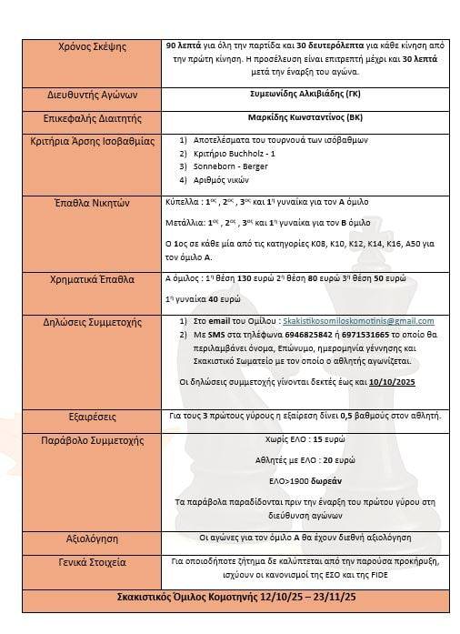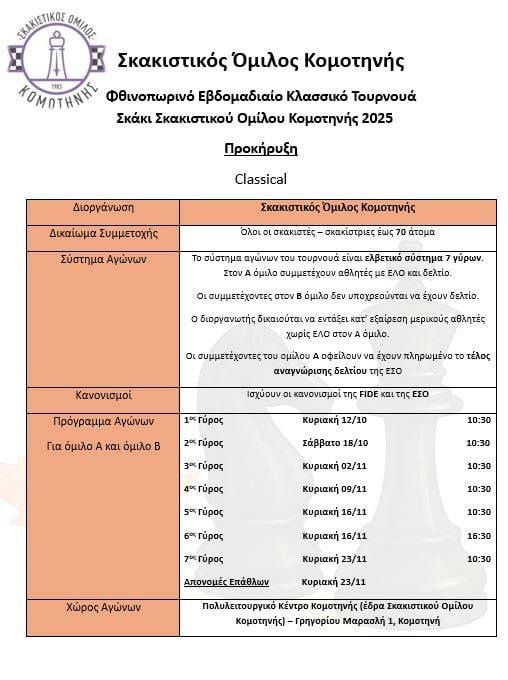 Ο Σκακιστικός Όμιλος Κομοτηνής ανακοινώνει την έναρξη του μεγάλου Φθινωπορινού Κλασσικού τουρνουά σκακιού, το οποίο ξεκινά στις 12/10 και τελειώνει στις 23/11!