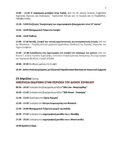 Σύμφωνα με το πρόγραμμα από την Παρασκευή 21 Απριλίου αναμένονται οι αφίξεις των συμμετεχόντων ενώ οι εργασίες θα ξεκινήσουν την 24 του μηνός στο Συνεδριακό Κέντρο του Δημαρχείου Σουφλίου.