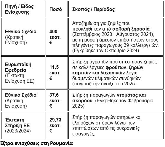 Κάτι τέτοιο το επιτρέπει και το κάνει και η Ευρωπαϊκή Ένωση. Από την περίοδο 2024-2025, εκτός από τις συνήθεις πληρωμές της Κοινής Αγροτικής Πολιτικής (ΚΑΠ), υπήρξε έξτρα ενίσχυση στους αγρότες σε διάφορες χώρες της Ευρωπαϊκής Ένωσης. Στην πρώτη εικόνα βλέπουμε για παράδειγμα τις έξτρα ενισχύσεις που δόθηκαν στην Ρουμανία και στη δεύτερη αυτές της Βουλγαρίας.