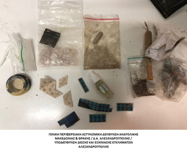 Σε δύο περιπτώσεις, την 27 & 28-9-2025 στο Συνοριακό Σημείο Διέλευσης Κήπων Έβρου, συνελήφθησαν από αστυνομικούς του Τμήματος Δίωξης Ναρκωτικών της Υποδιεύθυνσης Δίωξης και Εξιχνίασης Εγκλημάτων Αλεξανδρούπολης σε συνεργασία με αστυνομικούς του Τμήματος Διαβατηριακού Ελέγχου Κήπων και Τελωνειακούς Υπαλλήλους δύο αλλοδαποί, οι οποίοι οδηγώντας οχήματα μετέβησαν στο ανωτέρω Συνοριακό Σημείο Διέλευσης προκειμένου να πραγματοποιήσουν έξοδο από τη Χώρα και κατά την διάρκεια του ελέγχου που πραγματοποιήθηκε με την συνδρομή του αστυνομικού σκύλου ανίχνευσης ναρκωτικών ουσιών ¨LAIKA¨, βρέθηκαν στην κατοχή του πρώτου δράστη μία συσκευασία με μικροποσότητα κατεργασμένης κάνναβης και ένα τσιγάρο κάνναβης και στο εσωτερικό του οχήματος της δεύτερης δράστιδας -58- χαρτάκια εμποτισμένα με «LSD», μια σύριγγα με -1,9- ml «LSD», τρεις συσκευασίες με μικροποσότητες αμφεταμίνης, μια συσκευασία με ποσότητα «MDMA» βάρους -9,23- γραμμαρίων, μια κάψουλα και μια συσκευασία με μικροποσότητες παραισθησιογόνων μανιταριών, μια συσκευασία με μικροποσότητα ακατέργαστης κάνναβης αναμεμειγμένης με καπνό και δύο τσιγάρα κάνναβης, τα οποία και κατασχέθηκαν.