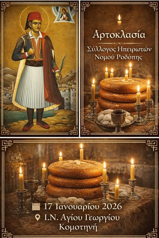 Το Σάββατο 17 Ιανουαρίου 2026 και ώρα 09:00, ημέρα εορτασμού του Προστάτη των Ιωαννίνων, Αγίου Γεωργίου εξ Ιωαννίνων, ο Σύλλογος Ηπειρωτών Νομού Ροδόπης θα πραγματοποιήσει αρτοκλασία υπέρ υγείας των μελών του, στον Ιερό Ναό Αγίου Γεωργίου Κομοτηνής.