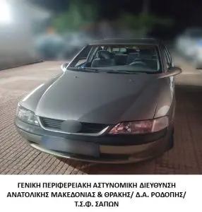Συνελήφθη στις 13-8-2023 το βράδυ σε Επαρχιακή οδό της Ροδόπης, από αστυνομικούς του Τμήματος Συνοριακής Φύλαξης Σαπών της Διεύθυνσης Αστυνομίας Ροδόπης σε συνεργασία με αστυνομικούς του Τμήματος Διαχείρισης Μετανάστευσης Ημαθίας, ένας (1) αλλοδαπός διακινητής, ο οποίος προωθούσε στο εσωτερικό της χώρας μη νόμιμους μετανάστες.