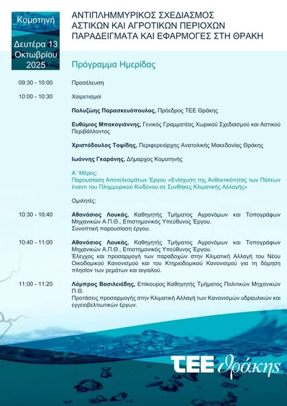 «Αντιπλημμυρικός Σχεδιασμός Αστικών και Αγροτικών Περιοχών – Παραδείγματα και Εφαρμογές στη Θράκη», τη Δευτέρα 13 Οκτωβρίου 2025, από τις 09:30 έως τις 18:00, στην Αίθουσα Συνεδριάσεων “Γεώργιος Παυλίδης” της Περιφερειακής Ενότητας Ροδόπης, στο Διοικητήριο Κομοτηνής (Λεωφ. Δημοκρατίας 1, 1ος όροφος).