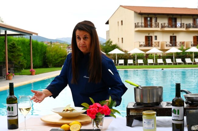 Το πιάτο σερβίρεται ιδανικά με κρασί ΜΕΛΕΑΓΡΟΣ ροδίτης Μοσχάτο του οινοποιείου Grivas Wines .