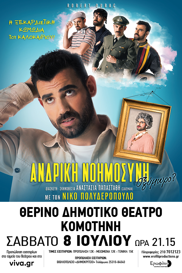 Οι θεατρικές επιχειρήσεις Ερωφίλη παρουσιάζουν σε περιοδεία για το καλοκαίρι του 2023 την βαθιά ανθρώπινη ξεκαρδιστική κωμωδία «ΑΝΔΡΙΚΗ ΝΟΗΜΟΣΥΝΗ-Οξύμωρο?» του Robert Dubac, με το Νίκο Πολυδερόπουλο, σε διασκευή – σκηνοθεσία Αναστασίας Παπαστάθη. Μια ξεκαρδιστική κωμωδία, που παίζεται με μεγάλη επιτυχία σε 100 χώρες σε όλο τον κόσμο.