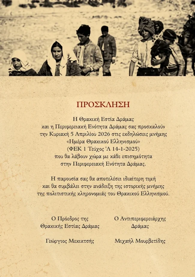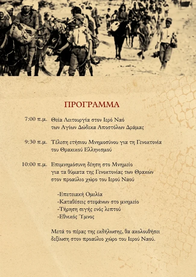 Η Θρακική Εστία Δράμας και η Περιφερειακή Ενότητα Δράμας σας προσκαλούν να τιμήσουμε μαζί τη μνήμη των θυμάτων της Γενοκτονίας του Θρακικού Ελληνισμού.