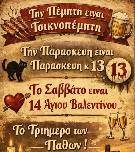 Έρχεται Τσικνοπέμπτη, Παρασκευή και 13, και Αγίου Βαλεντίνου. Εντάξει, τα έφερε έτσι το ημερολόγιο φέτος, αν τα καταφέρουμε από αυτό το τριήμερο που έρχεται, δεν φοβόμαστε τίποτε στο μέλλον. Από τα κοψίδια και τις παντσέτες, στις μαυρόγατες και να μην περάσουμε κάτω από σκάλα και θα κλείσουμε με κόκκινα τριαντάφυλλα, γλυκά-τούρτες αγάπης. Ένα τριήμερου άκρατου ρομαντισμού. Τον τόνο βέβαια θα τον δώσει όπως πάντα, η ελληνική τηλεόραση με διαφημίσεις και «ρεπορτάζ», είναι ικανοί να βγάλουν και τον Άγιο Βαλεντίνο σε απευθείας σύνδεση, με κουκούλα, να δηλώνει πόσο ερωτευμένος είναι. Εντωμεταξύ, φέτος συμπίπτει ο Βαλεντίνος με το Ψυχοσάββατο, έτσι για να γιορτάσουμε  και τους πεθαμένους    έρωτες.