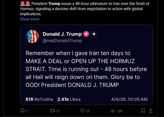 «Θυμάστε όταν έδωσα στο Ιράν δέκα ημέρες για να ΚΛΕΙΣΕΙ ΣΥΜΦΩΝΙΑ ή να ΑΝΟΙΞΕΙ ΤΑ ΣΤΕΝΑ ΤΟΥ ΟΡΜΟΥΖ; Ο χρόνος τελειώνει – 48 ώρες πριν ξεσπάσει η κόλαση πάνω τους. Δόξα στον ΘΕΟ!».