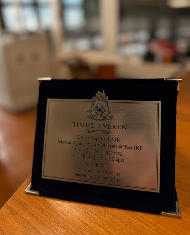 H Πυροσβεστική Υπηρεσία Κομοτηνής βράβευσε την εταιρεία Φαΐκ ΙΚΕ- Τεχνικό Πολυκατάστημα -Demir Market Faikler που συνέβαλε στο έργο της Πυροσβεστικής Υπηρεσίας Κομοτηνής, προσφέροντας ένα πλήρες σετ ελαστικών για πυροσβεστικό όχημα.