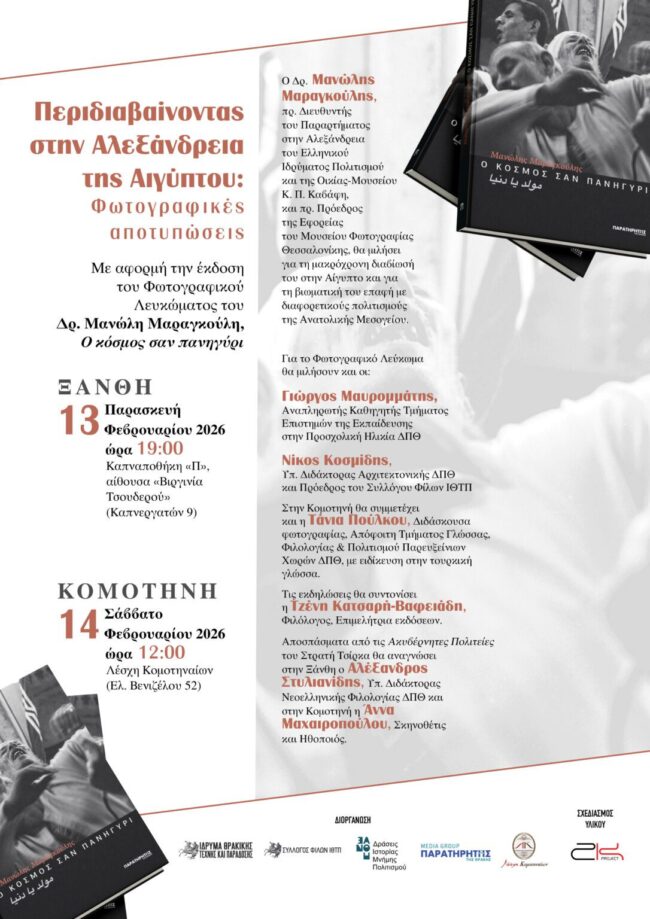 Με αφορμή την έκδοση του λευκώματος «Ο κόσμος σαν πανηγύρι» (εκδ. Παρατηρητής της Θράκης, 2025), ο Μανώλης Μαραγκούλης θα μιλήσει την Παρασκευή 13 Φεβρουαρίου, στις 19:00, στην Καπναποθήκη «Π», αίθουσα «Βιργίνια Τσουδέρου».