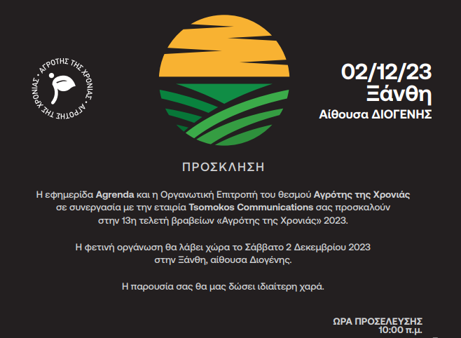 H εφημερίδα Agrenda, η Οργανωτική Επιτροπή του θεσμού “Αγρότης της Χρονιάς” και η εταιρεία Tsomokos Communications διοργανώνουν την 13η τελετή βραβείων “Αγρότης της Χρονιάς 2023”, στη διάρκεια της οποίας βραβεύονται αγρότες και συλλογικότητες της πρωτογενούς παραγωγής που ξεχωρίζουν για την οργάνωση, την ποιότητα, τον επαγγελματισμό και την καινοτομία τους.