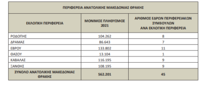 Ο αριθμός των εδρών των περιφερειακών συμβούλων της ΑΜ-Θ ορίζεται με βάση την απογραφή του μόνιμου πληθυσμού που πραγματοποιήθηκε το 2021 στη χώρα μας.